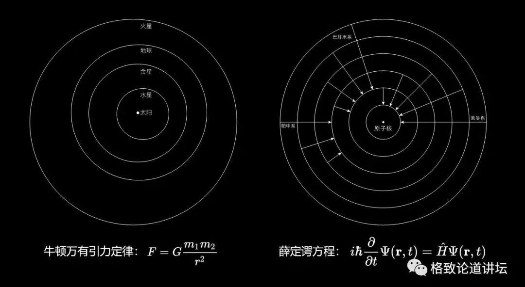 对于物理学家,他会觉得牛顿的万有引力定律也是非常美的。这么简单的一个方程就直接告诉了我们所有的天体是怎么运转的,包括在另外一个极端,在原子、分子层面上,薛定谔方程能够给予我们的关于微观现象的任何解答。
