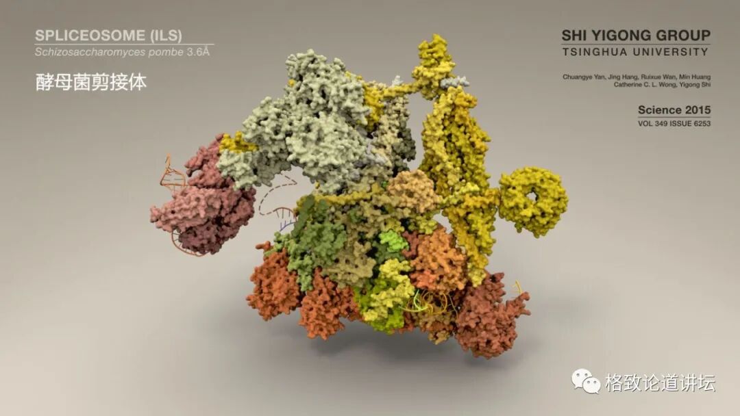 所以我觉得,科学的力量在认知层面增加了我们对美的感受。很多从科研论文里面拿出的图像,比如这个酵母菌的剪接体(清华大学施一公团队解析出来的一个剪接体结构),是由蛋白质和RNA组成的非常精密的剪接体。