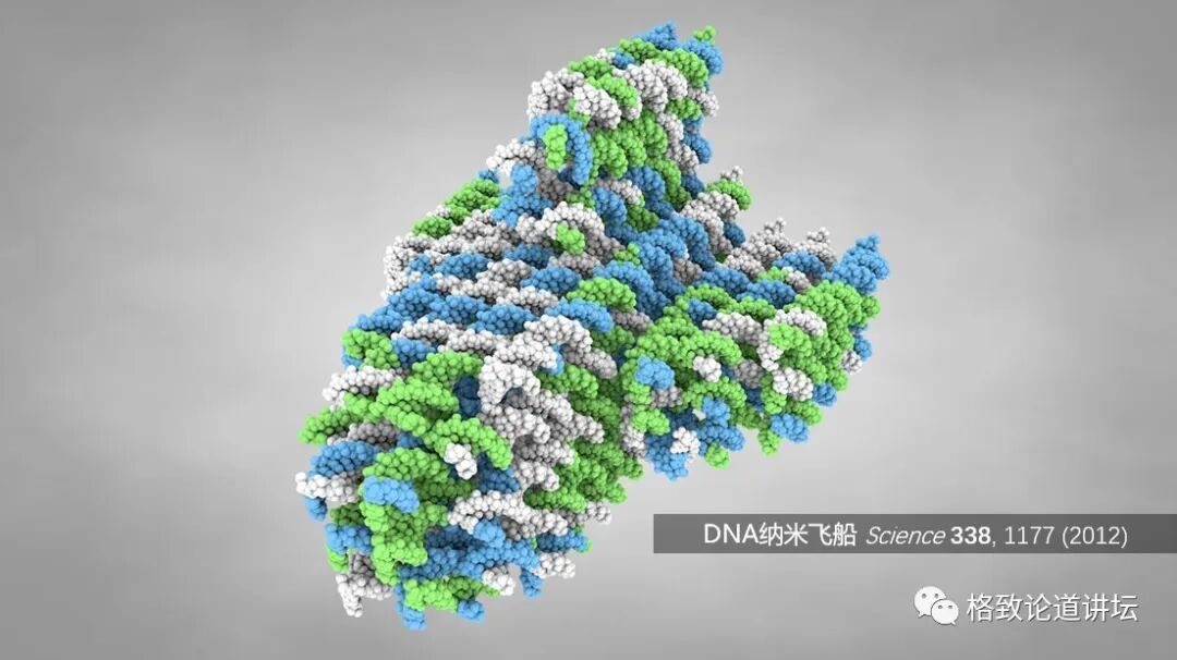 还有这艘真的用DNA自组装的方式组成的纳米飞船。科学家通过自组装的方式,将208根或者208类DNA单链混合到溶液中,这样的纳米飞船就会自动形成,这真的是非常神奇。DNA是大自然给我们的一个分子,我们正在向自然学习。