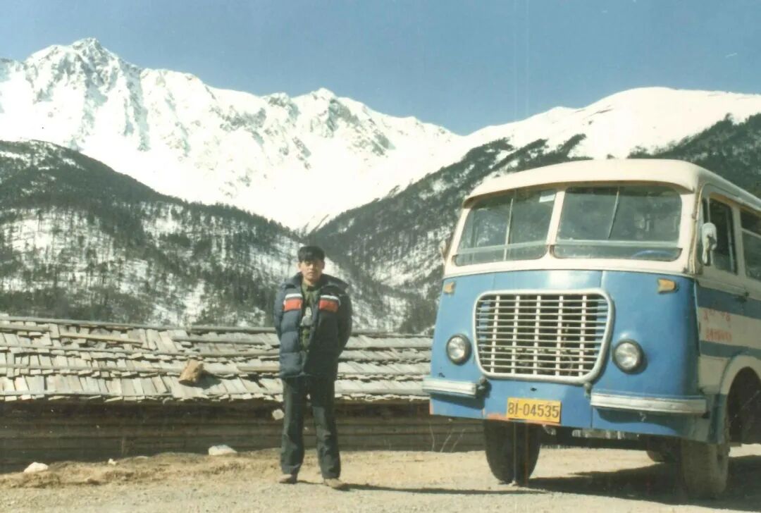 这是我第一次看见白马雪山,那年我在山里面住了159天,所以要带的东西还是比较多的。当时坐的还是动物所那辆老的车子——一辆解放牌的90马力的客车。如果仔细看这张照片,还能看到车上印着的“中国科学院昆明动物研究所”的字样。