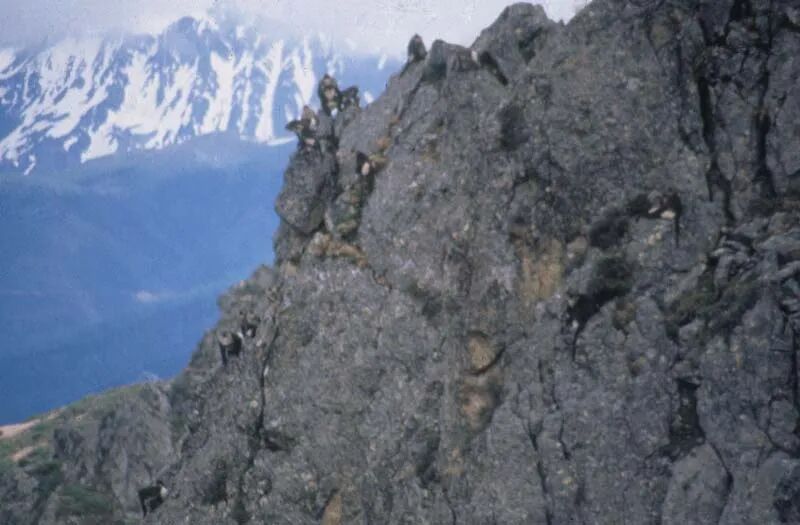 这是我们拍到的第一张滇金丝猴照片。我主要是想通过这张照片告诉大家,滇金丝猴非常美。这张照片可能不太能看清,我当时是用六十倍的单筒望远镜看的,所以看得非常清楚。
