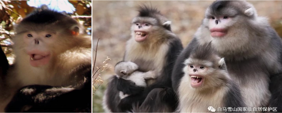而且滇金丝猴是有笑肌的,但到我真正拍到左边这张微笑的照片,用了十几年的时间。我只拍到了微笑,而在2019年,白马雪山保护区的同志拍到了右边这张滇金丝猴哈哈大笑的照片。
