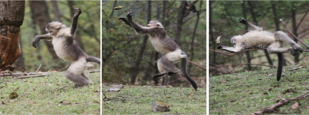 滇金丝猴最有意思的是它的娱乐活动,它会把石头、木块当做球来玩。这是因为它自己不会做球,所以只能把石头和木块作为玩具。从照片中我们可以看到,它的身姿非常优美,特别是最右边那只猴子“空中救球”的动作真的是非常让人吃惊,这不是训练出来的。
