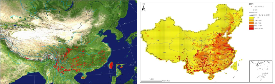 ▲ 左:中国灵长类分布,右:人口分布