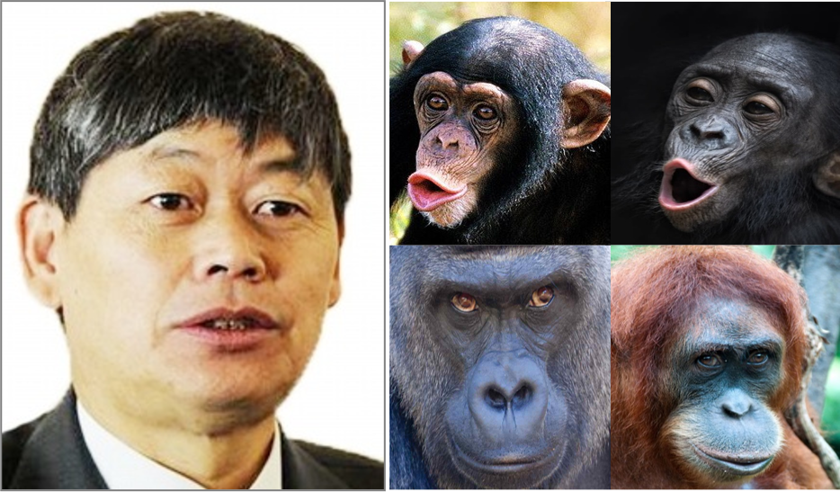 我把自己的照片跟现在世界上的公认的四种最像人的动物作了一个对比。在右图中,从上到下、从左到右分别是黑猩猩、倭黑猩猩、大猩猩、红毛猩猩。但是在我心中,它们跟我的长相很不一样。