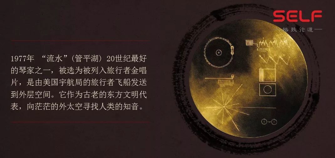 说到知音,我们常常听说一句话叫作“高山流水遇知音”,这个故事我相信很多朋友都听过,《高山流水》是中国的第一名曲。上个世纪的1977年,古琴一个大艺术家叫管平湖,管平湖先生录制的《流水》,这首琴曲就被美国宇航局的“旅行者”飞船所选录,代表的是人类的声音。所以中国古琴的《流水》这首曲子,就被刻唱了金唱片,现在还在外太空不断的循环,它还在寻找人类共同的知音。