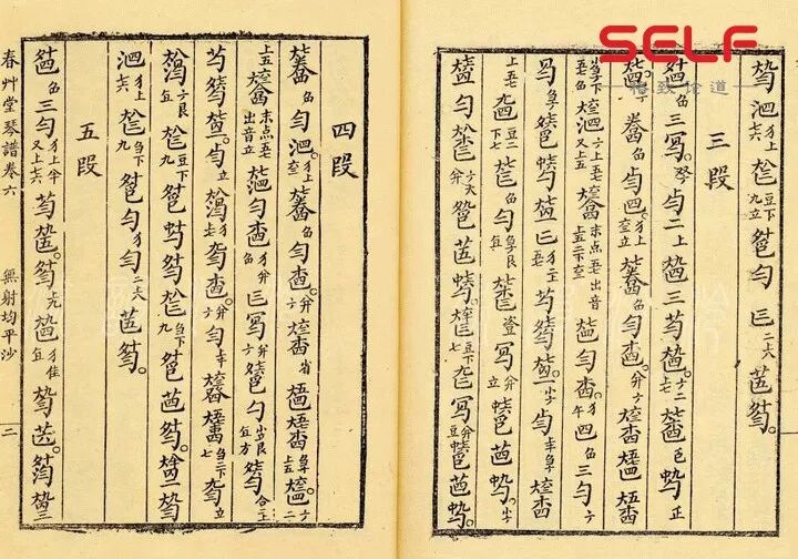 到了唐代,有一位叫曹柔的人,他发明了一种简字谱。这个谱子上面其实有很多字,我们是认识的,比如“大”表示左手的大指,“七”表示七弦,“二”表示二弦。