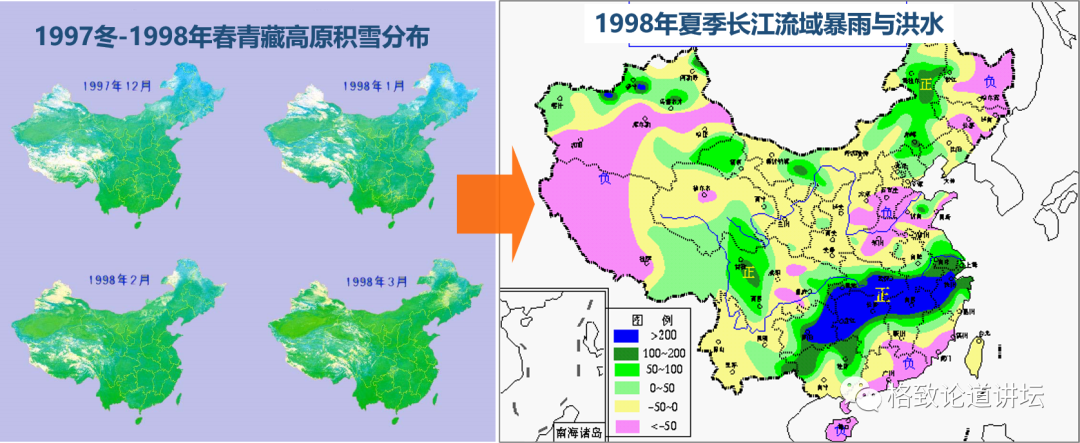 一个典型的例子就是1997年冬季到1998年春季,青藏高原大面积的积雪与1998年夏季长江中下游洪涝的关系。
