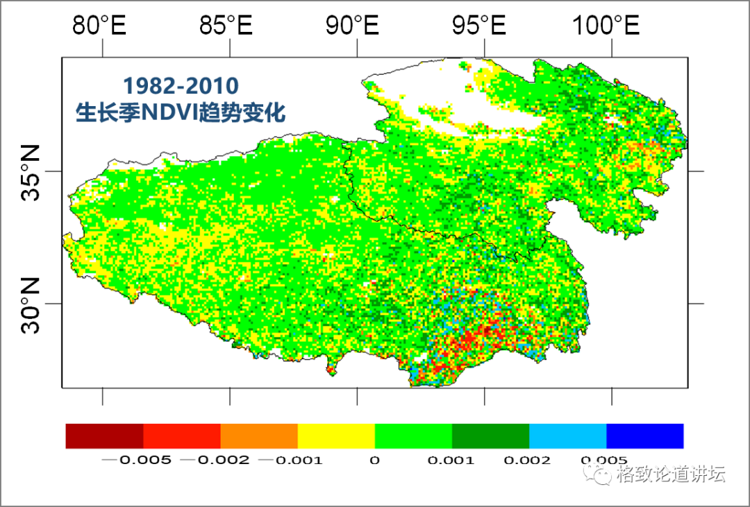 图中颜色变绿是代表逐渐增加的趋势,可以看到随着气候变暖变湿,青藏高原的植被一直向好的方面发展。