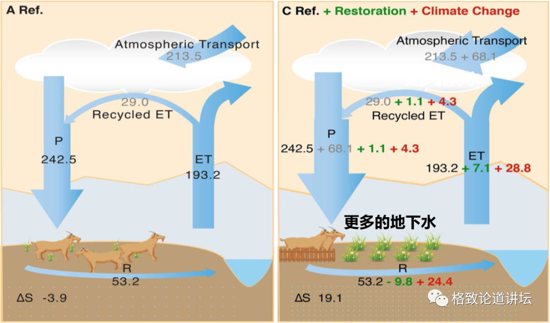 这张图是表示在三江源地区,我们经过植被生态恢复后,气候和土壤储水量的改变。通过生态恢复以后,地下的径流减小,表明更多的水保留在土壤中。同时一部分进入大气的蒸腾的水分又通过循环回到区域内。