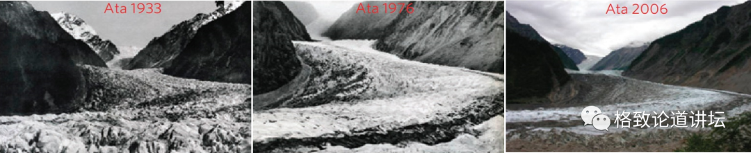 上面三张图是三个时期在同一个地点对西藏察隅阿扎冰川拍摄的照片。从视觉上可以直观地看到冰川退缩得非常强烈。