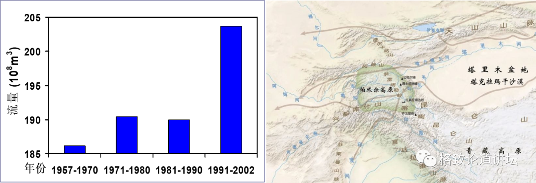 在整个青藏高原的西北部,虽然降水量变化不大,但由于气温增长比较厉害,冰川融化非常强烈。尽管塔里木河的水在九十年代几乎断流,但现在流入塔里木河的水量变得非常大,对新疆的绿洲有非常好的促进作用。