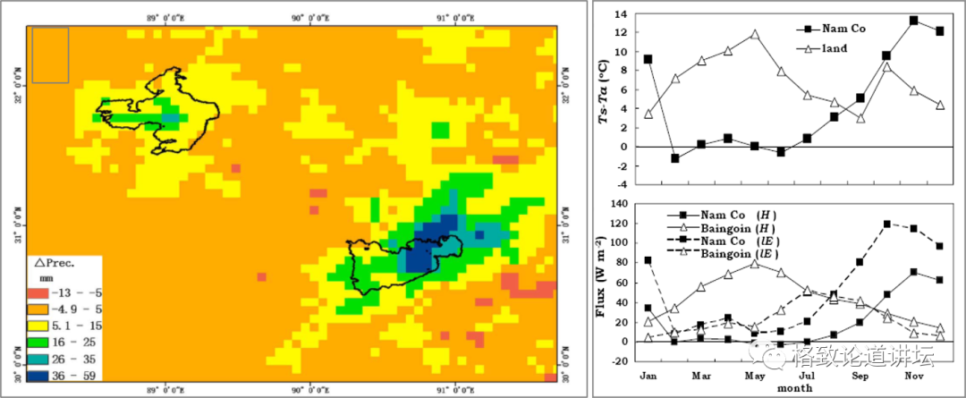 青藏高原的湖泊扩张也对整个气候变化带来一定的影响,特别是湖泊水面积的加大,会增加水循环和大气的含水量。