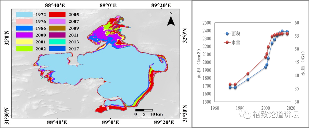 色林错湖泊的扩张是青藏高原湖泊扩最为明显的例子。上面左图中不同颜色代表不同时期下水面覆盖的面积,也是它湖水到达的一个边界。浅蓝色是在1972年湖泊的覆盖范围,深蓝色是2017年的湖泊覆盖范围。