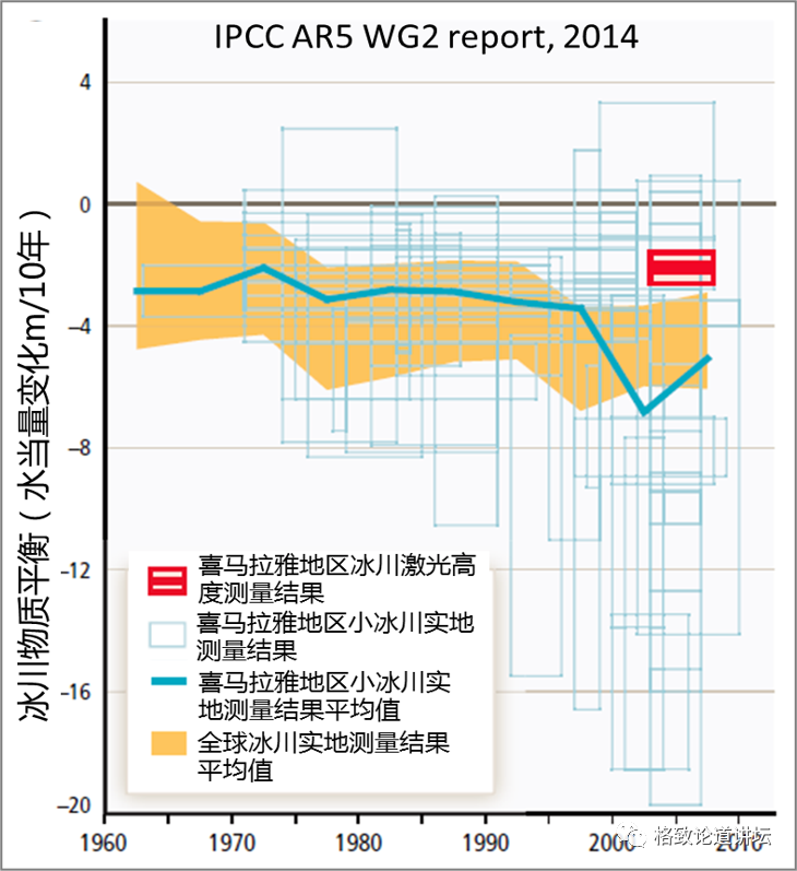 上图是IPCC(政府间气候变化合作组织)给出的喜马拉雅山地区冰川退缩的趋势图。从图中可以发现,冰川在这几十年退缩得非常强烈。