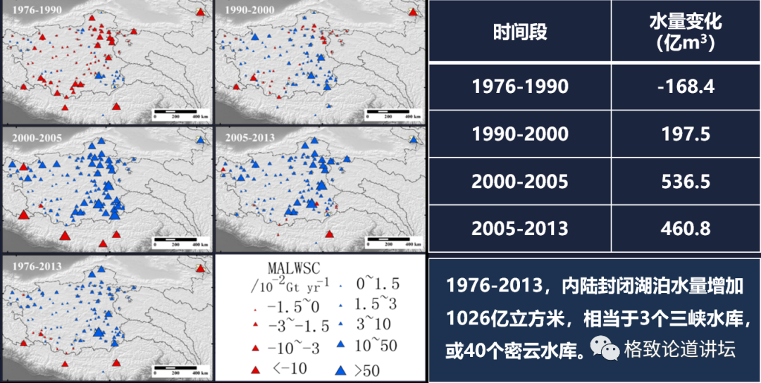 我们利用遥感卫星影像分析和八十几个湖泊的测量,还原了湖泊的繁衍,发现现在青藏高原的湖泊水量增加了1026亿立方米,相当于3个三峡水库或40个密云水库的水量。