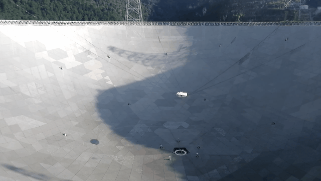 这是天眼实际运行时的展示图,它是几代人的努力的结果。天眼与阿雷西博望远镜相比的进步之处或者说不同之处是,它不仅更大,而且不只有一面。它是把一个直径500米的球冠的一部分,分割成4500面反射单元;通过实时调节这些反射单元,把它们从球冠的一部分变成一个抛物面。