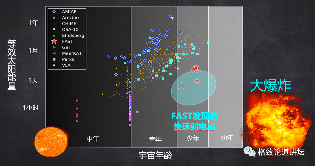 快速射电暴是什么呢?它是一个不重复的、毫秒量级的脉冲,而且非常亮。上图展示了所有已经发表的超强爆发,它们来自宇宙深处。这里的纵轴表示的是等效太阳能。这种爆发在较弱时,千分之一秒内就相当于太阳一小时的能量,在较强时则相当于太阳好几年的能量。因为它离地球比较远,所以到达地球时它看似是一个比较弱的无线电信号,但实际上它在爆发的时候是非常亮的。