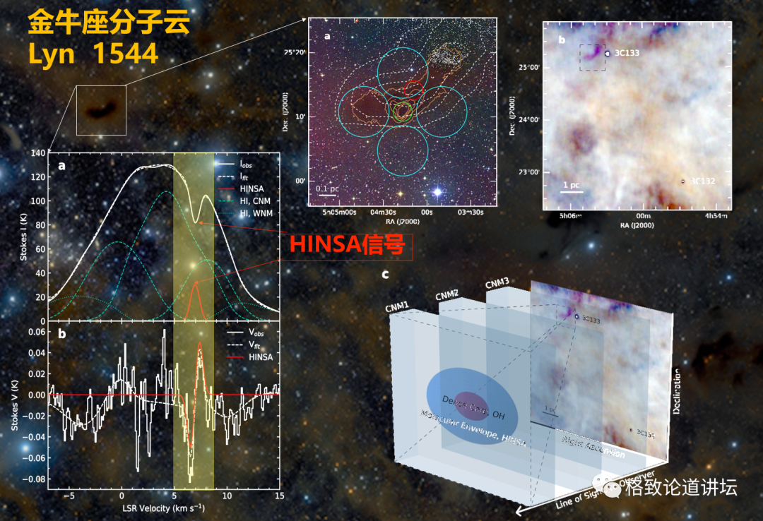这是我们通过原子氢和分子氢相互碰撞后冷却,然后产生HINSA塞曼效应的特征完成的。上图中的条纹表示磁场的方向,灰色部分是这个金牛座分子云的尘埃的和气体的真实数据。这个成果最终发表在2022年1月《自然》杂志的封面上。