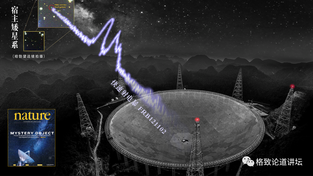 快速射电暴这个领域是很年轻的。2007年,人类知道了银河系外存在这种神秘的爆发。2012年11月2日,快速射电暴源121102第一次出现在人类的观测数据里。2017年,它才被定位下来。在这之后,我们就得以观测它周围的恒星和这个星系的红移。基于这次发现,科学家确定了快速射电暴(FRB)来自宇宙深处。这是快速射电暴的理解机制上的里程碑事件,这个快速射电暴源以及这次定位被认为是自LIGO引力波探测之后天文学最重大的发现。但是,我们现在依然不能理解它的天文起源和物理机制。