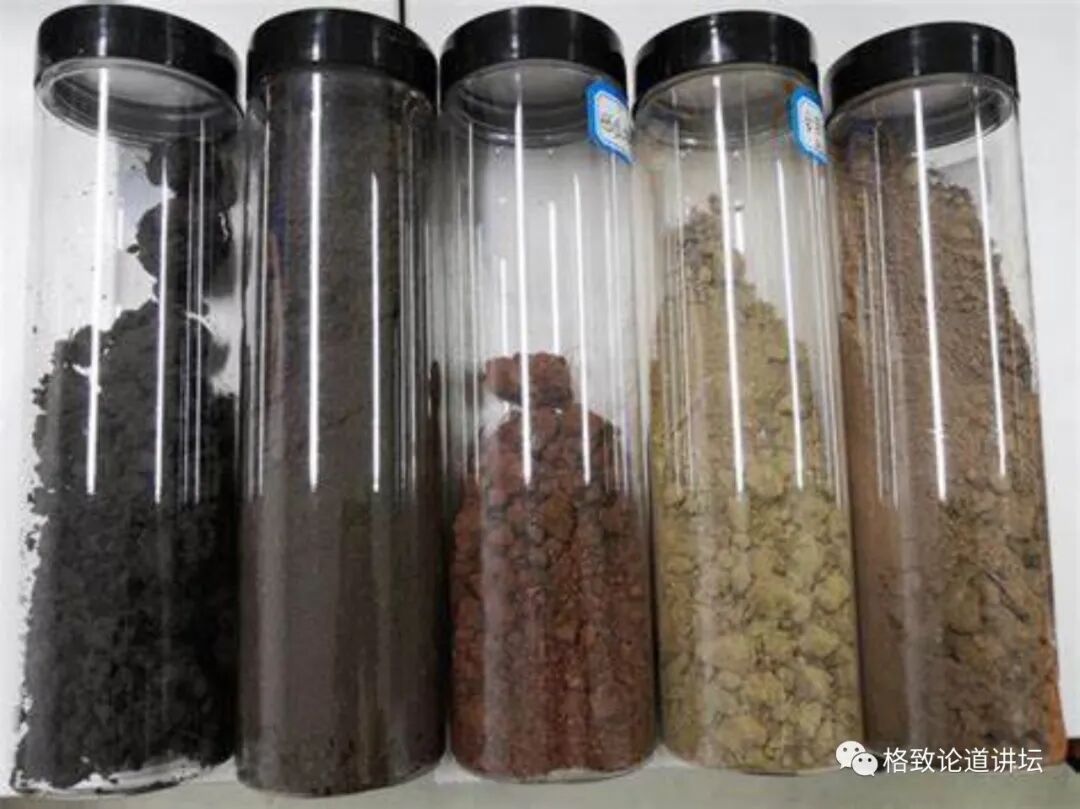 但是现在大家看,这里有几个瓶子,不同颜色的土壤性质不一样,最关键的是有机质含量不一样。但是特殊的发白的,那个里边有盐分的,就是另一种颜色了。