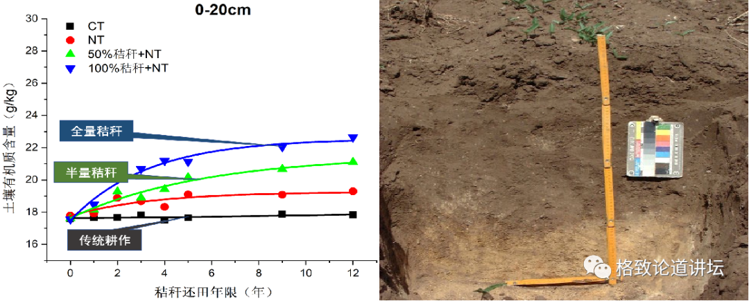 所以除了微生物,我们首先看看这对有机质到底有没有影响。通过十几年的研究可以发现,有机质确实提高了,耕作的时候有一定的深度,耕层是20公分,20公分里的有机质能够增加。