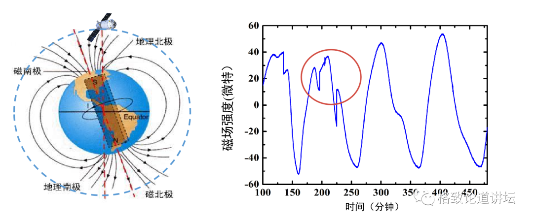 从图中我们可以看到,它每隔90分钟绕地球一周,轨道高度400千米。它一直在切割磁力线,右图就是它所感受到的磁场强度图。这个地磁场已经被我们削弱了一万倍。我们可以看到图中有一个红色的圈。