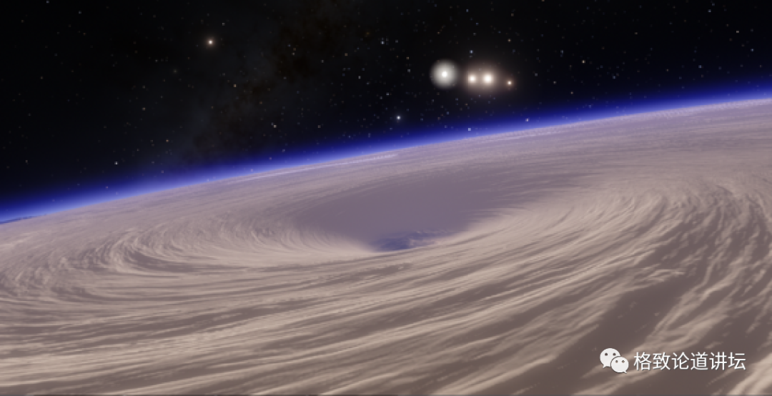 现在我再来解释一下什么叫激光冷却原子。上图是风暴云图,风暴的中心叫风暴眼,风暴眼的状态其实是非常安静的,但风暴眼外的物体就会受到强大的力量挤压。