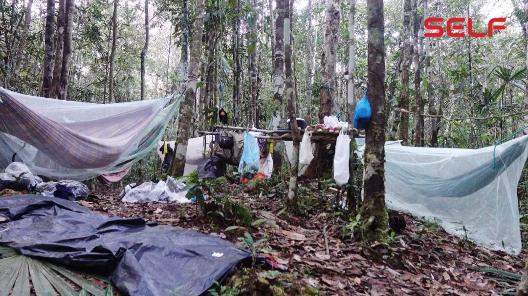 这是我们住的地方。有人会问,为什么不住帐篷呢?这是吊床,因为地上不一定只有蛇,还有别的东西。我们在睡觉的时候都要蒙上脸,为什么?因为美洲豹看到生物的头,就会过去咬它的脖子,如果你睡觉脸在外面的话美洲豹就会咬你,所以我们睡觉的时候要把头遮住。