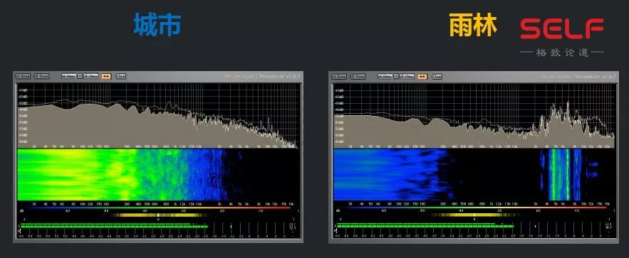 我们拿城市的声音和雨林的声音做了一个对比,左边的是城市的声音,右边是雨林的声音,你会发现城市的声音是非常没有规律,是一大片过去的,但是雨林的声音在我刚才说的中高频有一个凹陷,那个频率是对生物非常重要的频率。