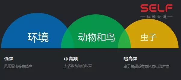 接下来中高频的频率,我们听到的鸟叫声都在那里面,包括树懒的声音都在里面。那是一个稍偏寂静的频率,那个地方比其他的地方频率低。我发现很有意思,这些生物就像商量好一样,都不去占据这个频率。因为这个频率很重要,一个是交配,一个是警示,它们都不去占据这个空间。