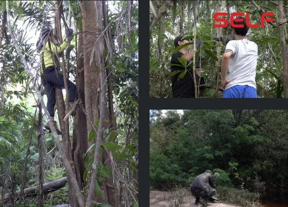 这是我们在雨林里工作的场景,我们也有被逼上树的技能。因为我们想把录音机架设在不同的地方,但是录音的时候那些生物会躲着我们,所以必须要把录音机留在雨林里面。