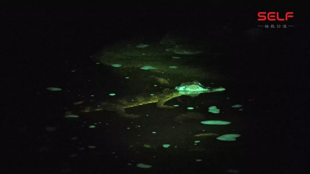 晚上在篝火旁边烤肉的时候,我们的向导拿着手电筒说看看今天晚上都有什么邻居,一照就是这只绿色的鳄鱼在河里,而且不止一只,有几十只都在我们洗澡的河里。