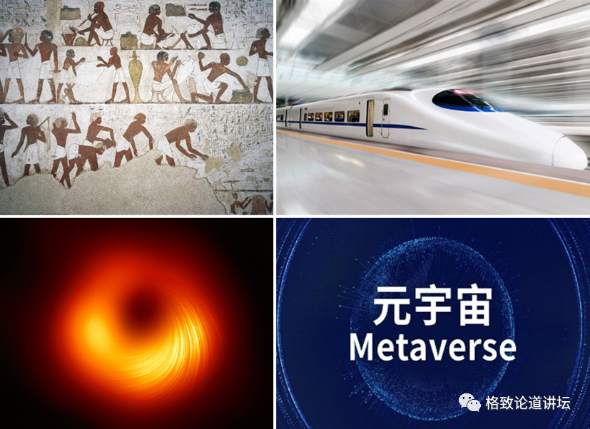 左上角这张是古代文明,大家一看就知道了。今天我们有了高铁、飞机,有了手机,天文学家也观测到了黑洞的照片,我们甚至有了元宇宙这样的特别新形态的也许叫做社会概念。那说到古代文明和现代文明的区别,我觉得主要的区别就是科学和技术的发展所带来的生产力以及人类认识自然的进步。