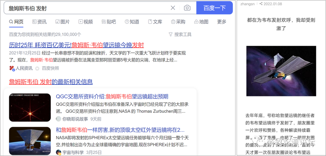 比如前不久,美国的詹姆斯·韦伯望远镜发射。在那一天和之后的一段时间里,关于韦伯望远镜发射的消息完全刷屏,这是我在百度上面查到的,大约有3000万条。过了几天之后,我写了一篇文章。我说大家都在为韦伯发射欢呼,我却受刺激了。