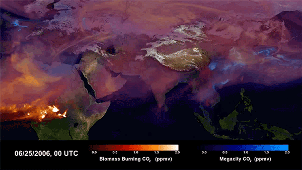 如何通过浓度来进行源汇的计算?这张图是非洲大火的示意图。大家可以形象地看到,由于火形成了烟雾,烟雾弥散到全球。我们通过卫星全球观测的优势,就可以准确地观测、计算浓度。
