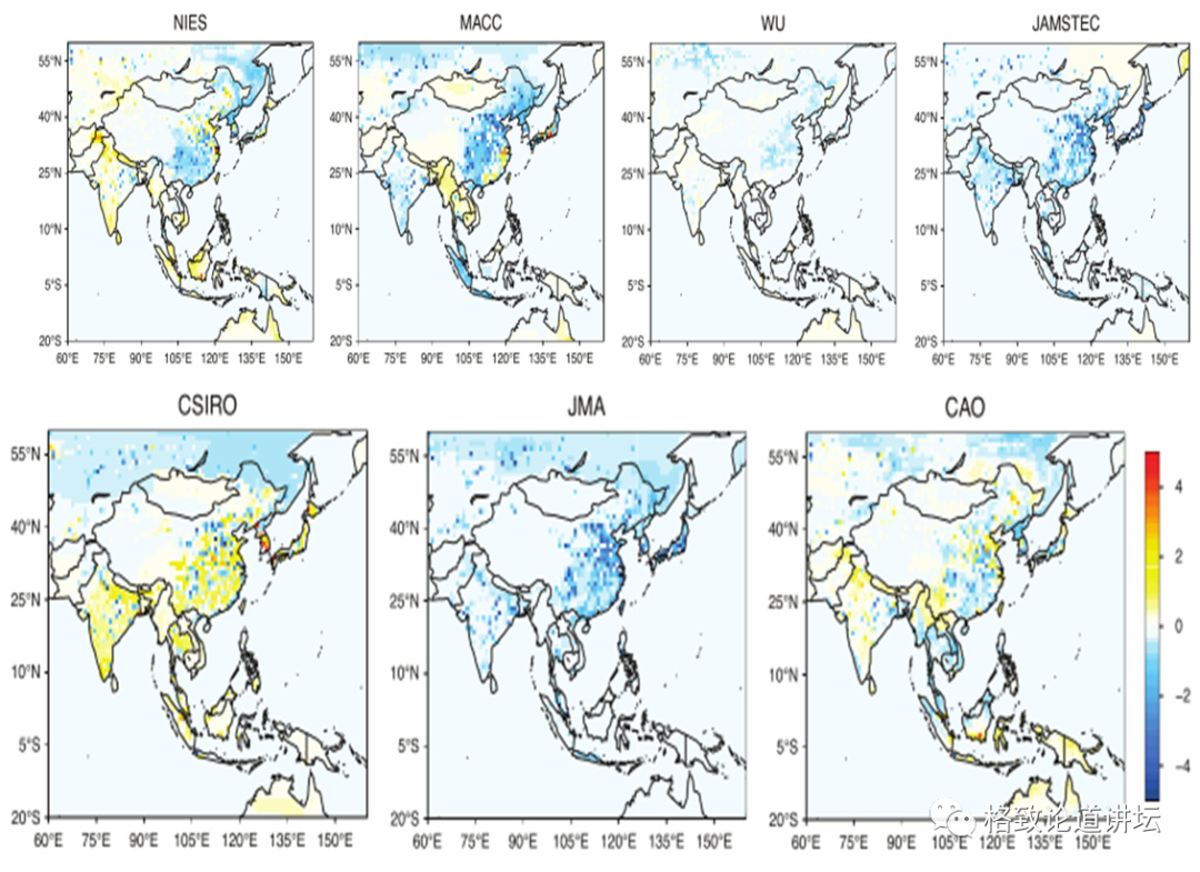 图片依次为:日本国立环境研究所、法国气候与环境科学实验室、荷兰瓦赫宁根大学、日本海洋地球科技署、澳大利亚英联邦科学和工业研究组织、日本气象厅、俄罗斯中央高空气象台的计算结果