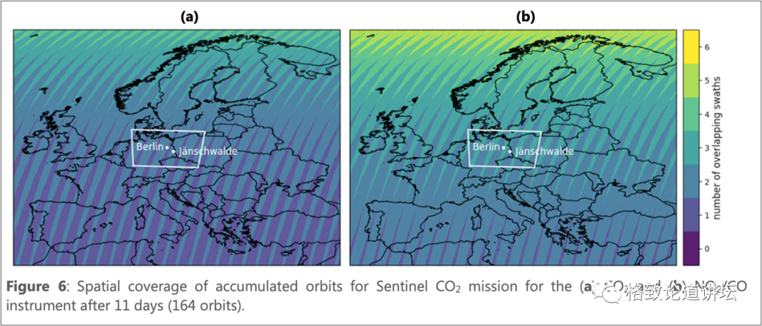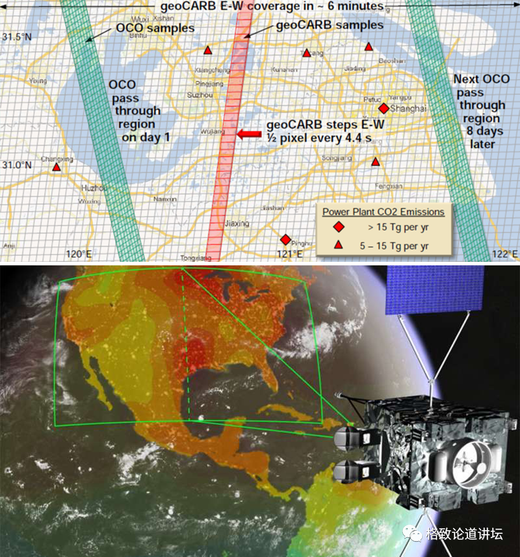从图中可以看到,它在一天的扫描就给出了一个非常好的覆盖。两条绿色轨道就是OCO-2相隔8天观测。
