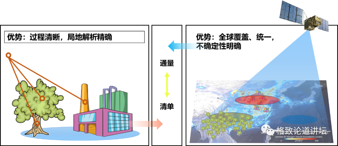 另外一个就是今天要给大家分享的自上而下的方法。我们如何利用快速发展的卫星技术,对自下而上的清单法进行辅助或者补充。我们知道低轨卫星一百零几分钟绕地球1圈,一天有15到16圈;而且它的探测器是唯一的,可以连续几年观测。所以就形成了全球覆盖、均一、不确定性可以计算的优势。由此,自上而下和自下而上能够形成互补和校验。
