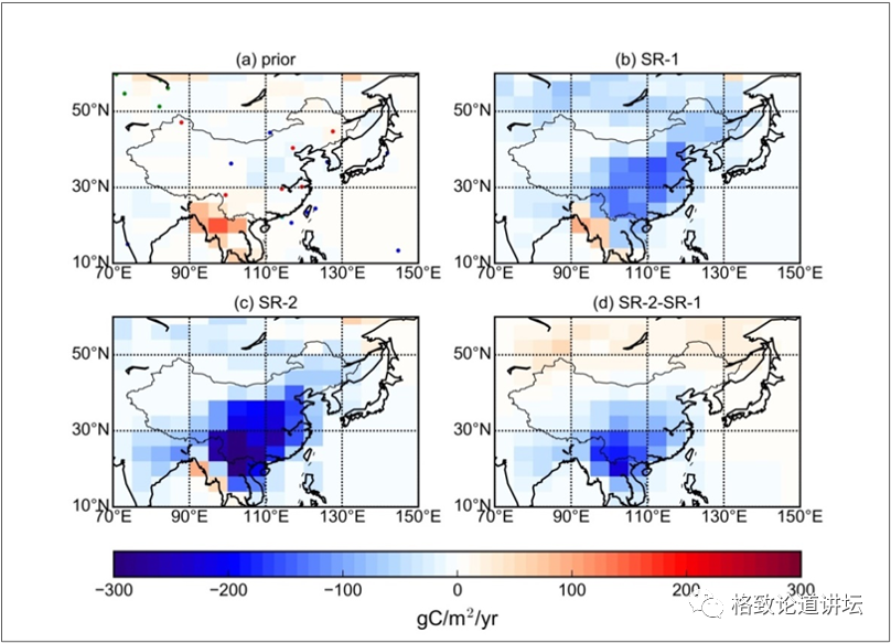 我们又利用了前面介绍的OCO-2,它有3-4年的数据,GOSAT有10年数据。我们把卫星的数据输入到系统里,图c就是用地面浓度得到的结果。根据日本和美国的卫星,不管从空间分布、季节变化还是最后的数值上看,都证明了中国确实存在比较大的被低估的陆地生态系统碳汇。