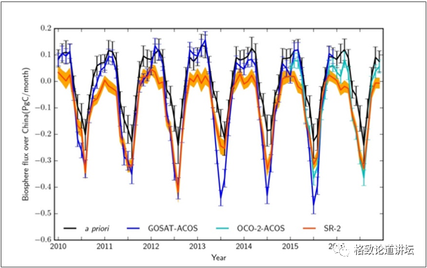 大家注意到这张图上蓝线往下的这个尖角,它就表示夏季卫星观测到更强的吸收,说明中国夏季的碳汇应该更大。