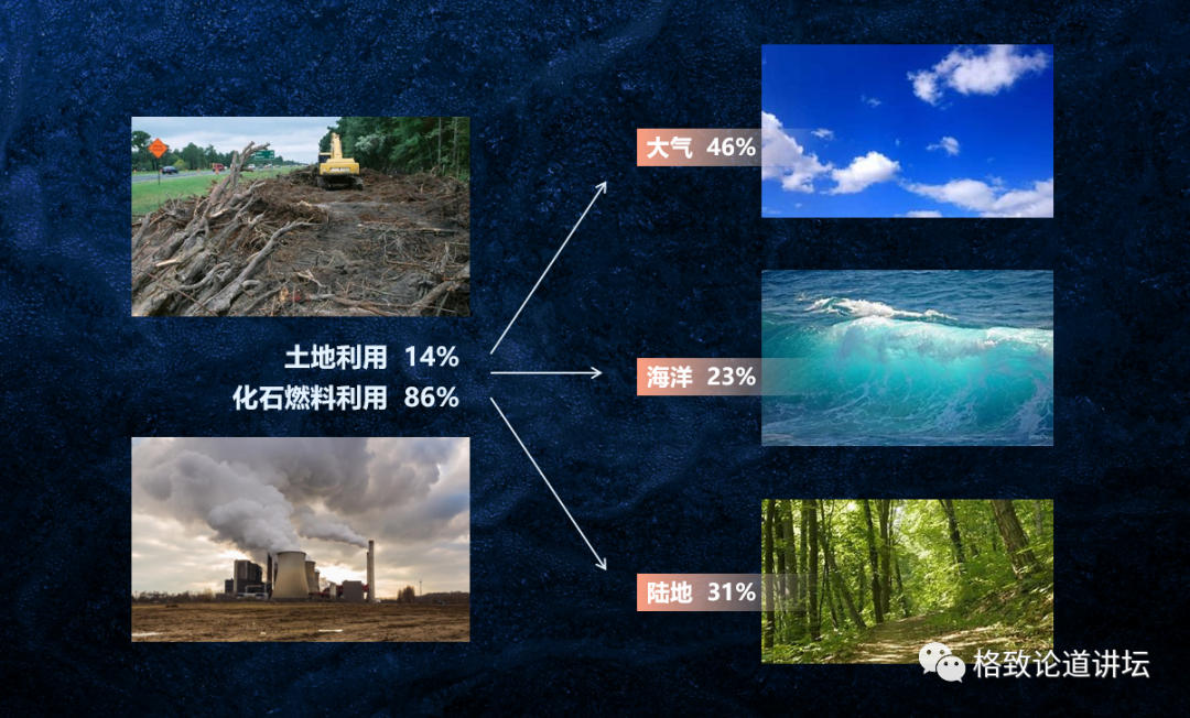 全球碳的产生端(排放)到消纳端(吸收)其实是不同年代的结果。从排放端来看,化石燃料基本上占大头,有80%多;还有14%是土地利用,比如从森林转成农田。吸收端有两大块,一块是海洋,另一块是陆地生态系统,这两部分“吃”掉了大概50%左右的人类碳排放。