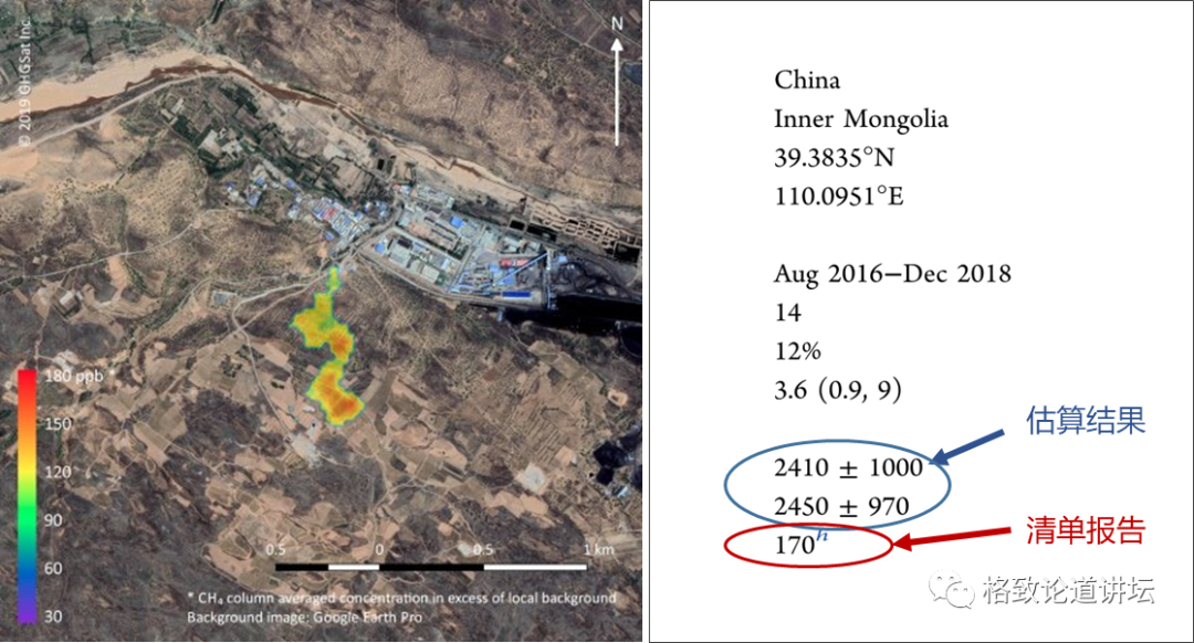 另外,加拿大的私人公司也发射了甲烷监测卫星。大家看黄色区域,就用GHGSAT卫星监测到了中国内蒙某煤矿的甲烷排放。我们自己报的数值是170,用卫星估算的是2400,所以这个就差十几倍。