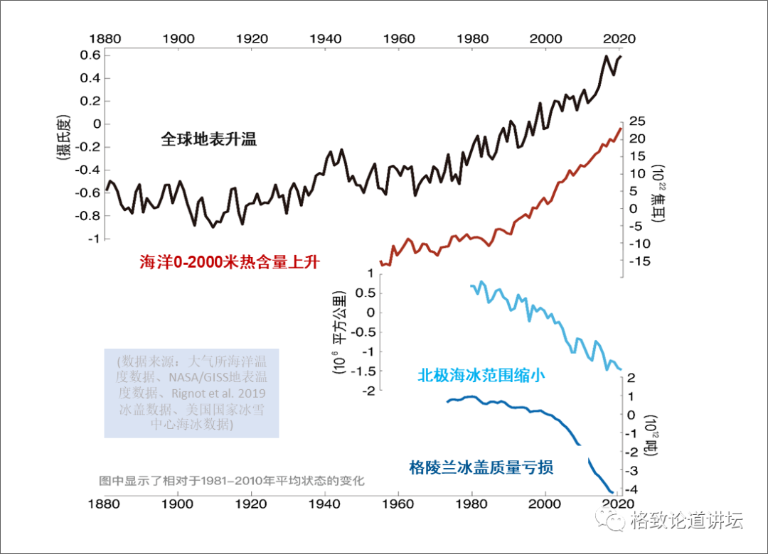 ▲ 数据来源:大气所海洋温度数据、NASA/GISS地表温度数据、Rignot et al. 2019冰盖数据、美国国家冰雪中心海冰数据