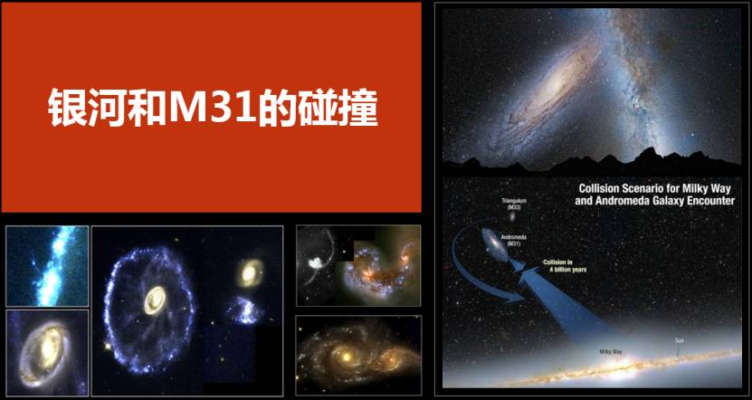 其实宇宙里面星系和星系之间碰撞是经常发生的事情。比如这个图里面,我放了几个离我们比较近的星系和星系碰撞的漂亮图片。我结婚的时候甚至用了其中一个图片作为邀请卡背景,你看两个星系碰出了一个心的形状,这是很常见的。