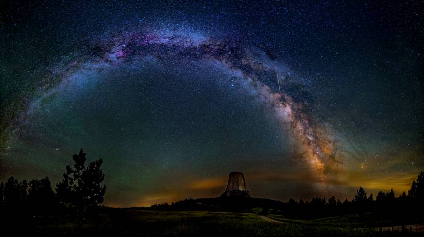 这张图片拍摄的是一个比较震撼的银河系照片,它拍摄于美国北部的一个国家公园里。如果你把这个银河系照片的样子拉直,然后把中间很亮的地方放在中心的话,你可以看到,我们银河系的相当于一个全景图,它看上去像一个盘子的形状,然后中间会更亮更厚一些。