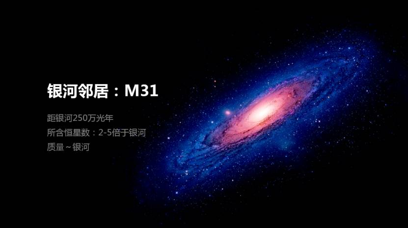 我们知道,银河系是有邻居的,它并不是孤零零的一个星系。它大概处在一个叫本星系群的群体里面。这个群体大概有30到50个星系左右,里面大部分的星系个体都比银河系矮小。但是有一个个大的邻居,它就是仙女座大星云(M31),尺寸比银河系还要大,它距离银河系大概有两百五十万光年的样子。