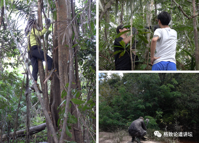 这是我们在雨林里工作的场景,我们也有被逼上树的技能。因为我们想把录音机架设在不同的地方,但是录音的时候那些生物会躲着我们,所以必须要把录音机留在雨林里面。