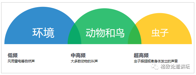 这个时候我发现了一些规律。我们在雨林里面的声音,其实排布是很有规律的。非常高的频率是虫子,就是我们刚才看第一个画面的时候听到的声音,那个声音就是虫子,它的区间非常高的频率是十几K的时候,是虫子在叫。