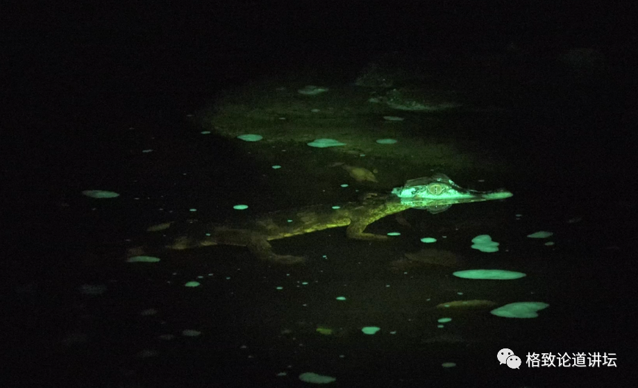 晚上在篝火旁边烤肉的时候,我们的向导拿着手电筒说看看今天晚上都有什么邻居,一照就是这只绿色的鳄鱼在河里,而且不止一只,有几十只都在我们洗澡的河里。
